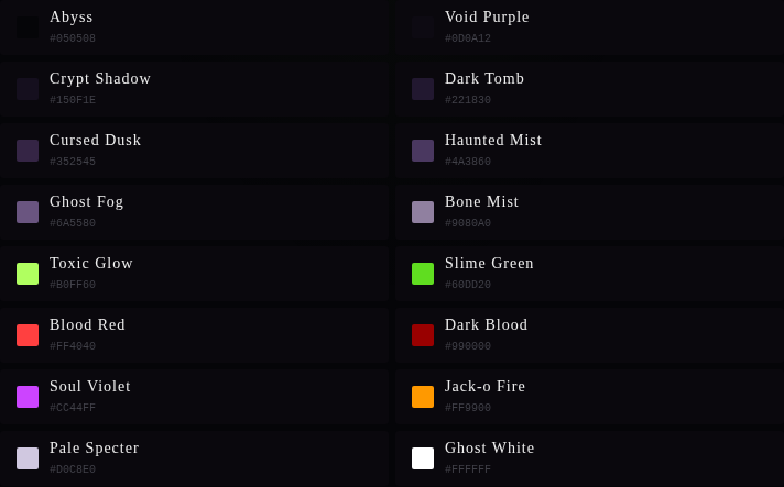 Abyss · Void Purple · Crypt Shadow · Dark Tomb · Cursed Dusk · Haunted Mist · Ghost Fog · Bone Mist · Toxic Glow · Slime Green · Blood Red · Dark Blood · Soul Violet · Jack-o Fire · Pale Specter · Ghost White