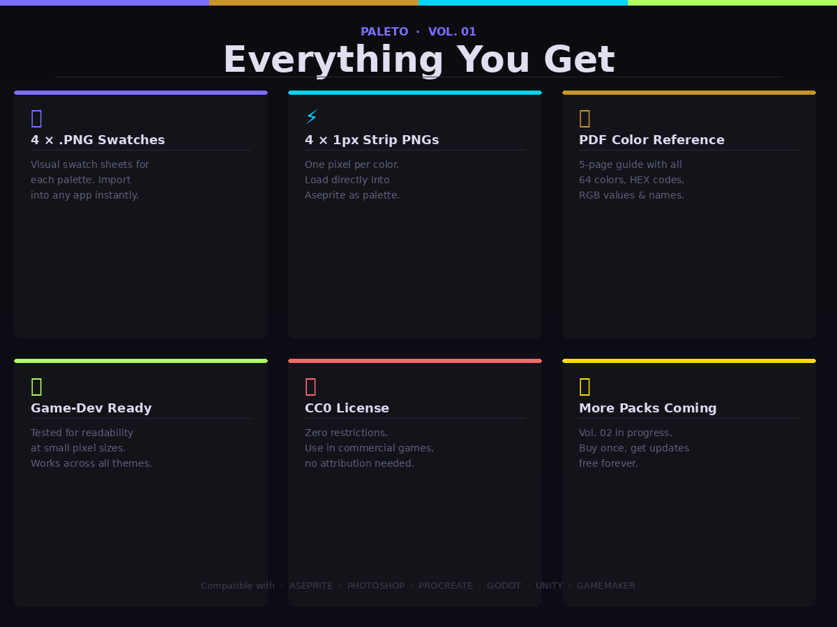 - 4 × .ASE palette files (Aseprite & Photoshop native)