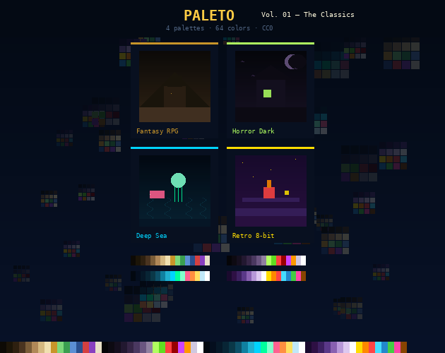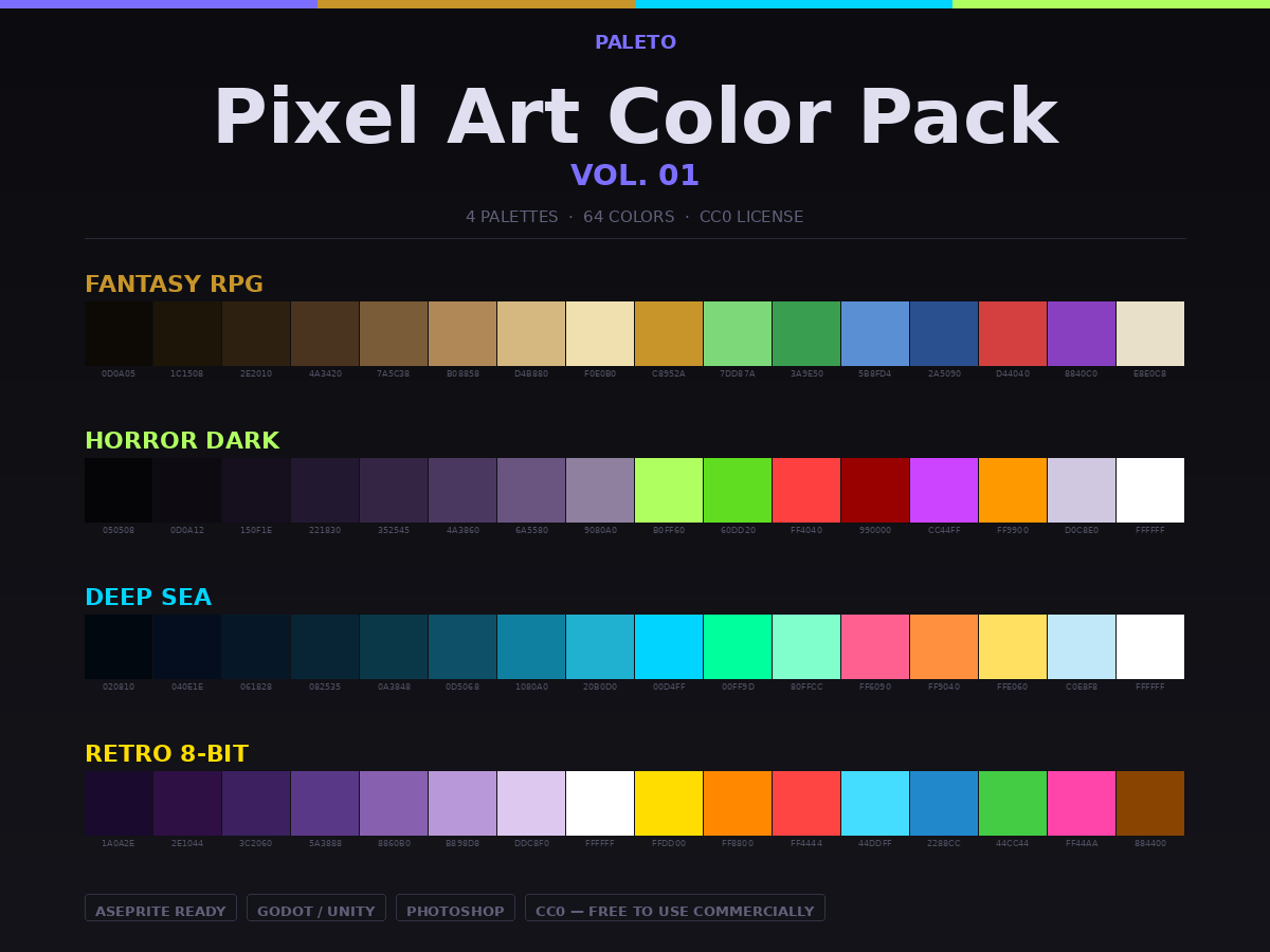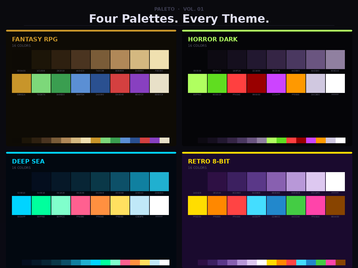 4 pixel art palettes for indie game devs and pixel artists. Fantasy RPG, Horror Dark, Deep Sea and Retro 8-bit. CC0 — free commercial use, no attribution required.