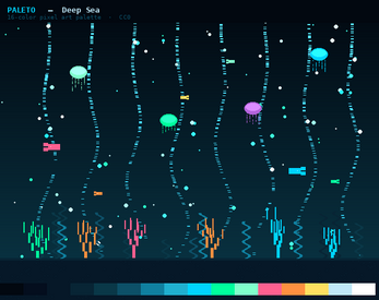 DEEP SEA — Ocean void to bioluminescent cyan, jellyfish mint, coral pink and light beams. For underwater worlds and aquatic levels.